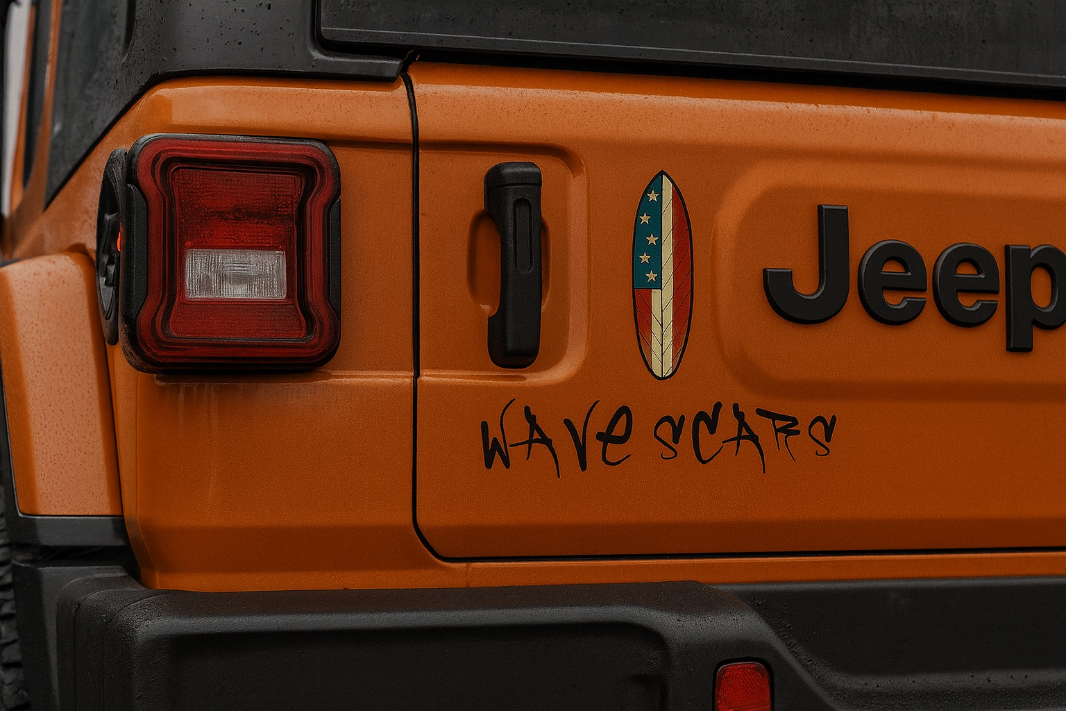 This “Stars & Scars” edition features a cracked American flag surfboard paired with bold WAVESCARS graffiti—perfect for Jeeps, surf gear, laptops, and anywhere you want to show pride with attitude.