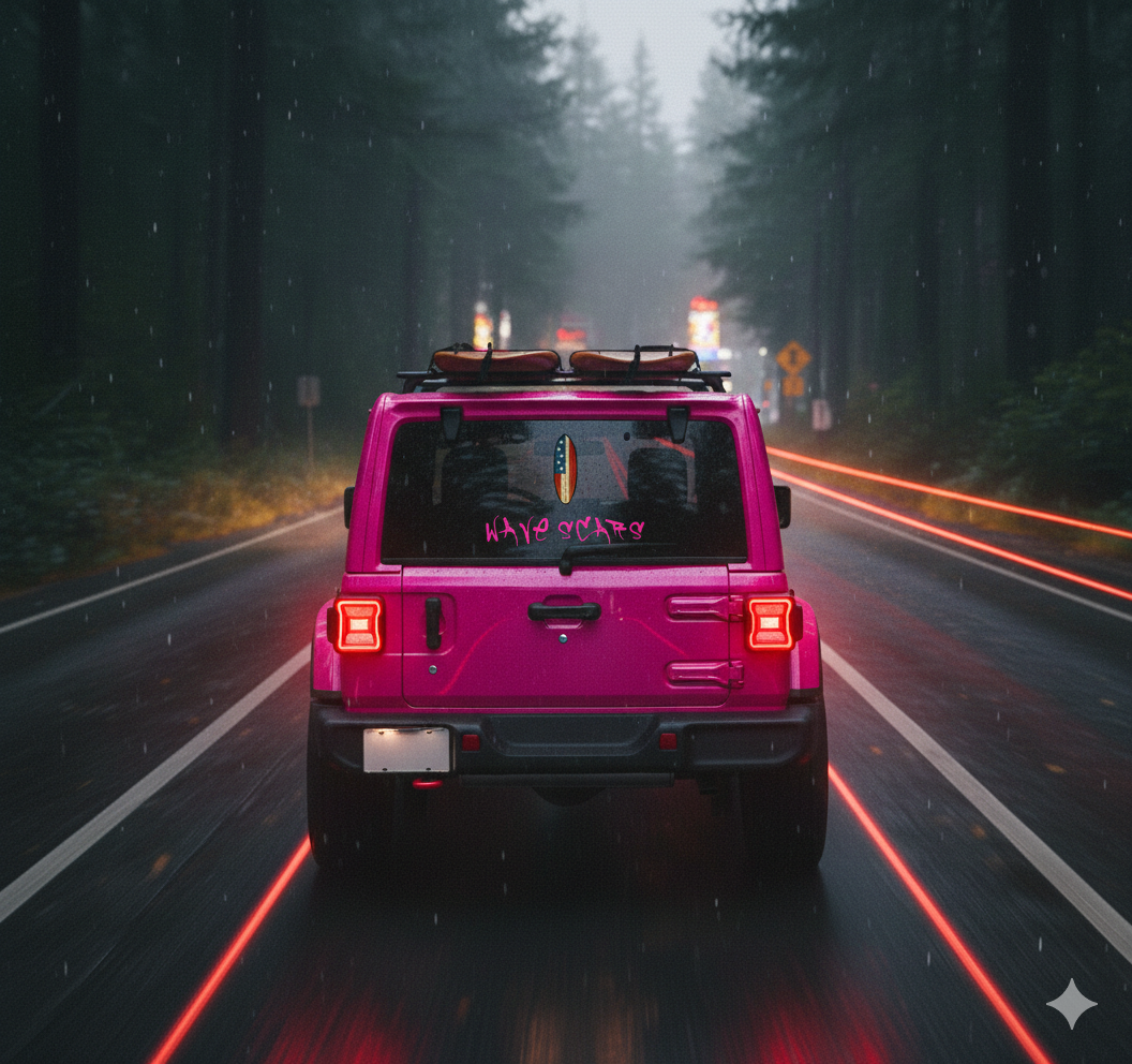 This “Stars & Scars” edition features a cracked American flag surfboard paired with bold WAVESCARS graffiti—perfect for Jeeps, surf gear, laptops, and anywhere you want to show pride with attitude.